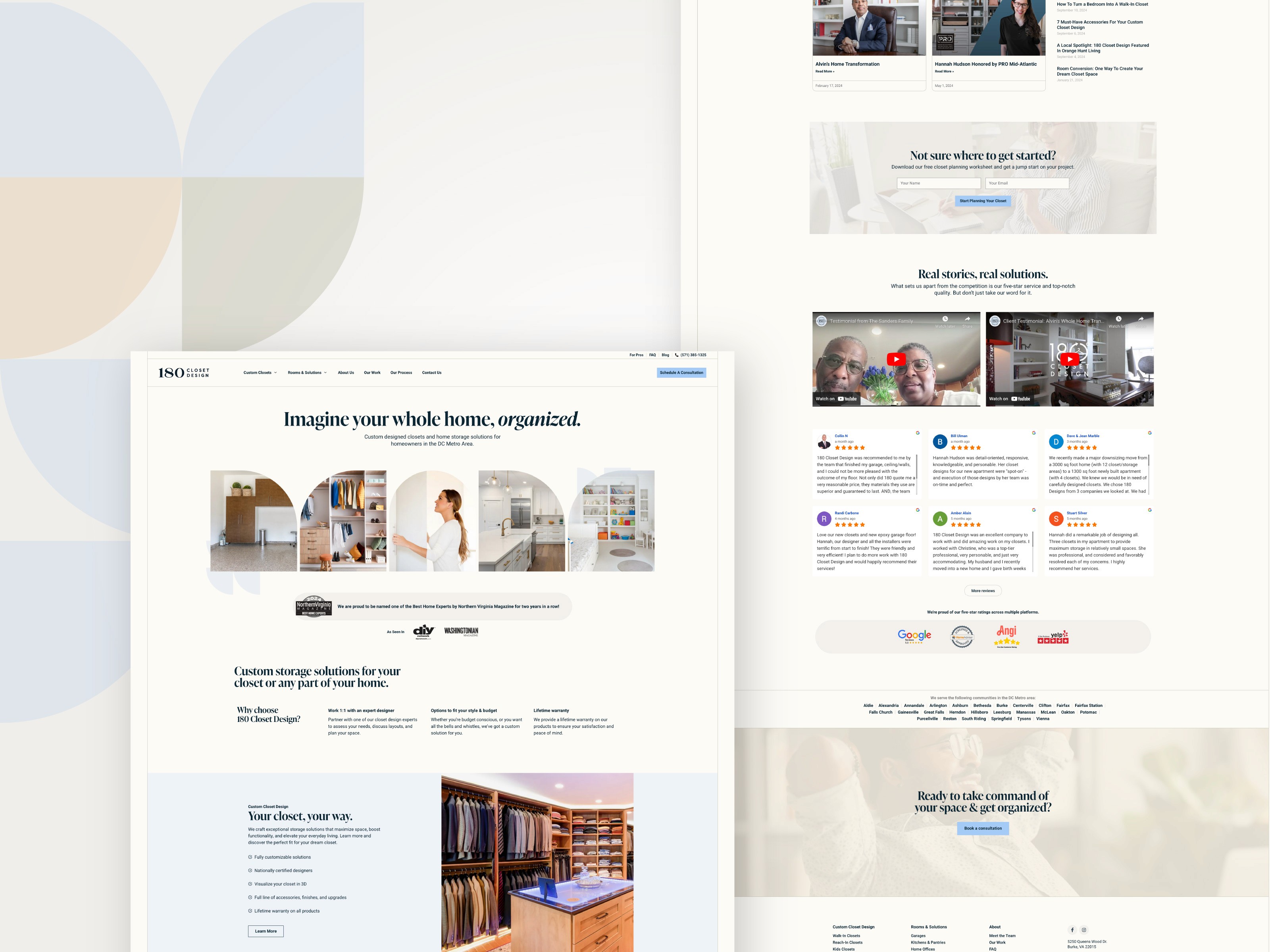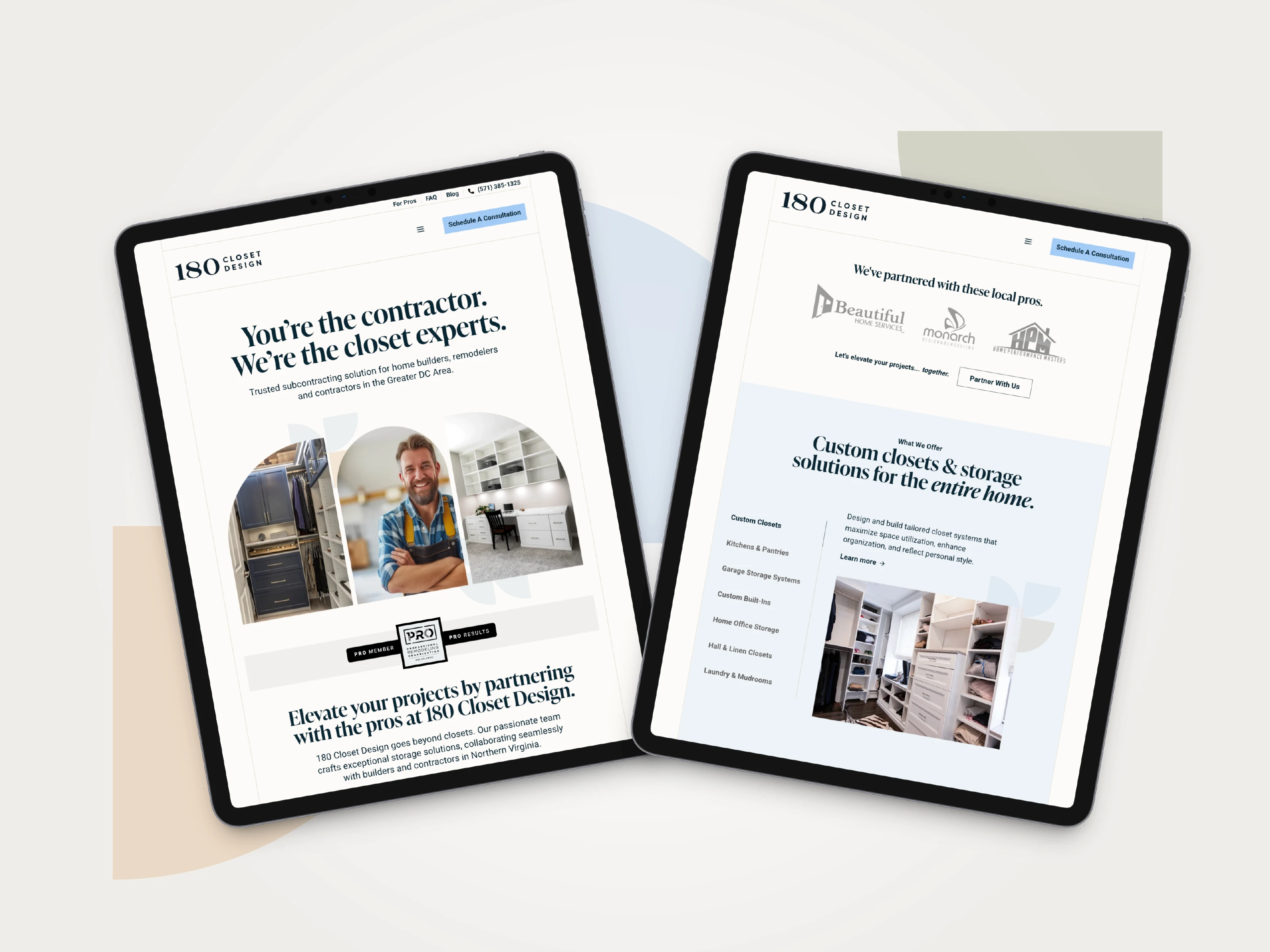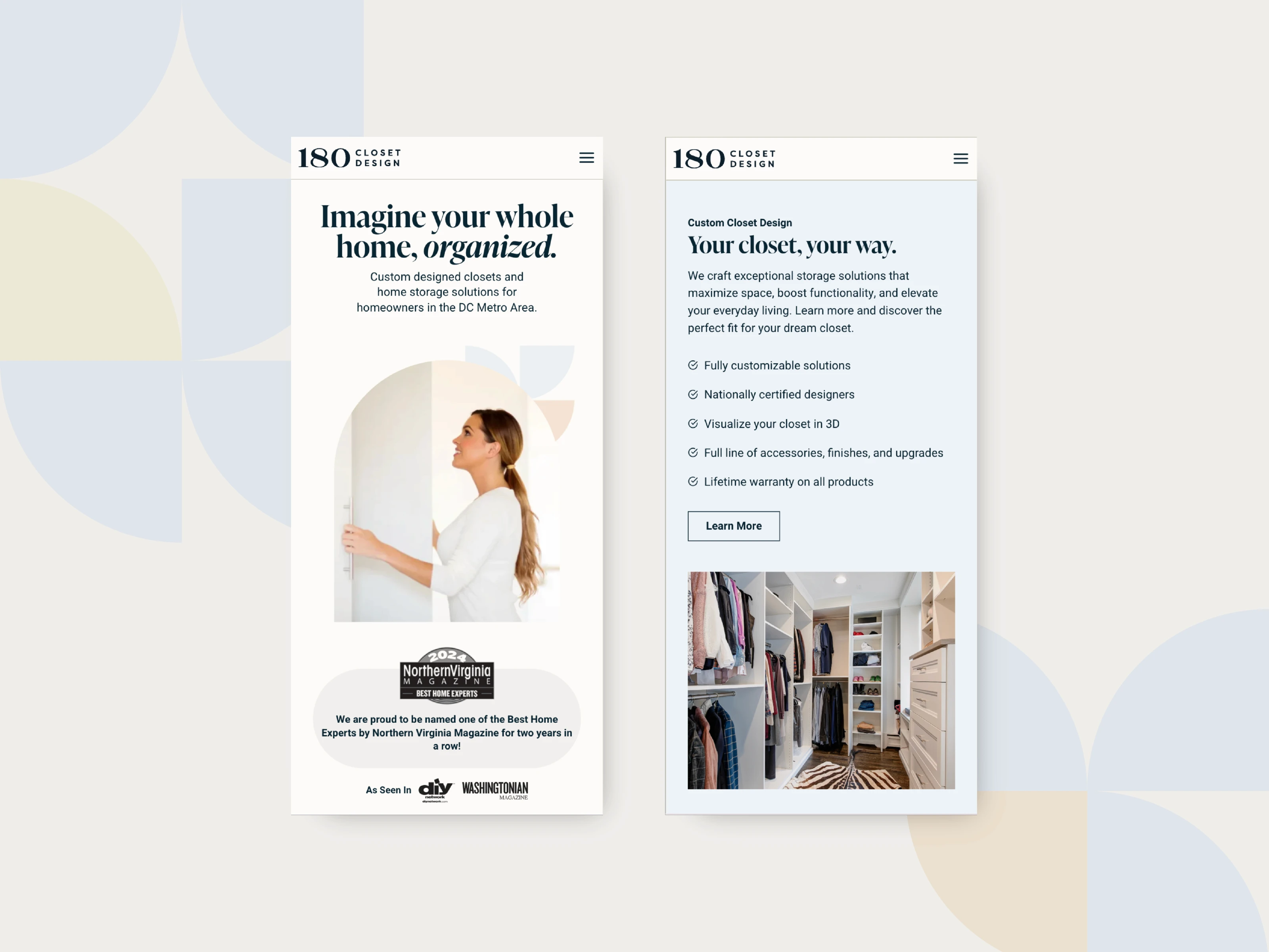 180 Closet Design, a provider of custom storage solutions in the Northern Virginia area, felt that their outdated branding and clunky website was hindering their ability to attract new clients. To address these issues, I ran collaborative sessions to uncover the core brand values and attributes that they wanted to convey. With these insights, as well as information about their target audience, I developed a new logo emphasizing clarity and simplicity along with brand visuals that relate to both order and customizability. From there, I designed and built a search-engine optimized website, improving site architecture and navigation as well emphasizing trust-signals for site visitors. Sine launching the new website, 180 Closet Design has seen an averagle 200% increase in monthly leads.