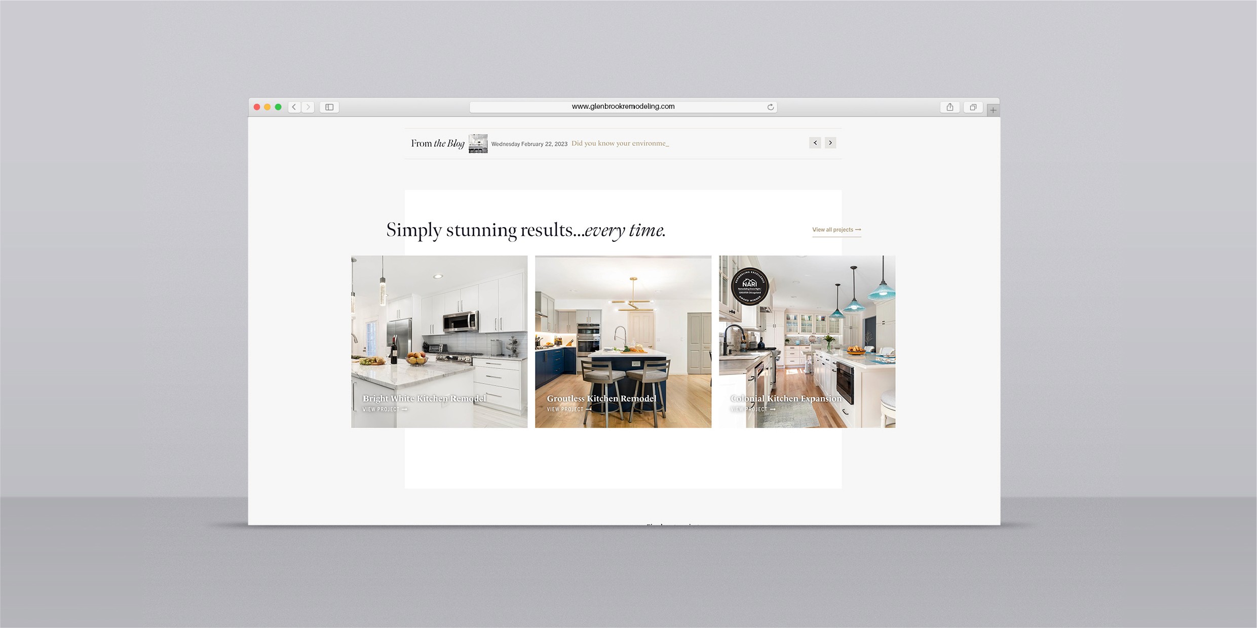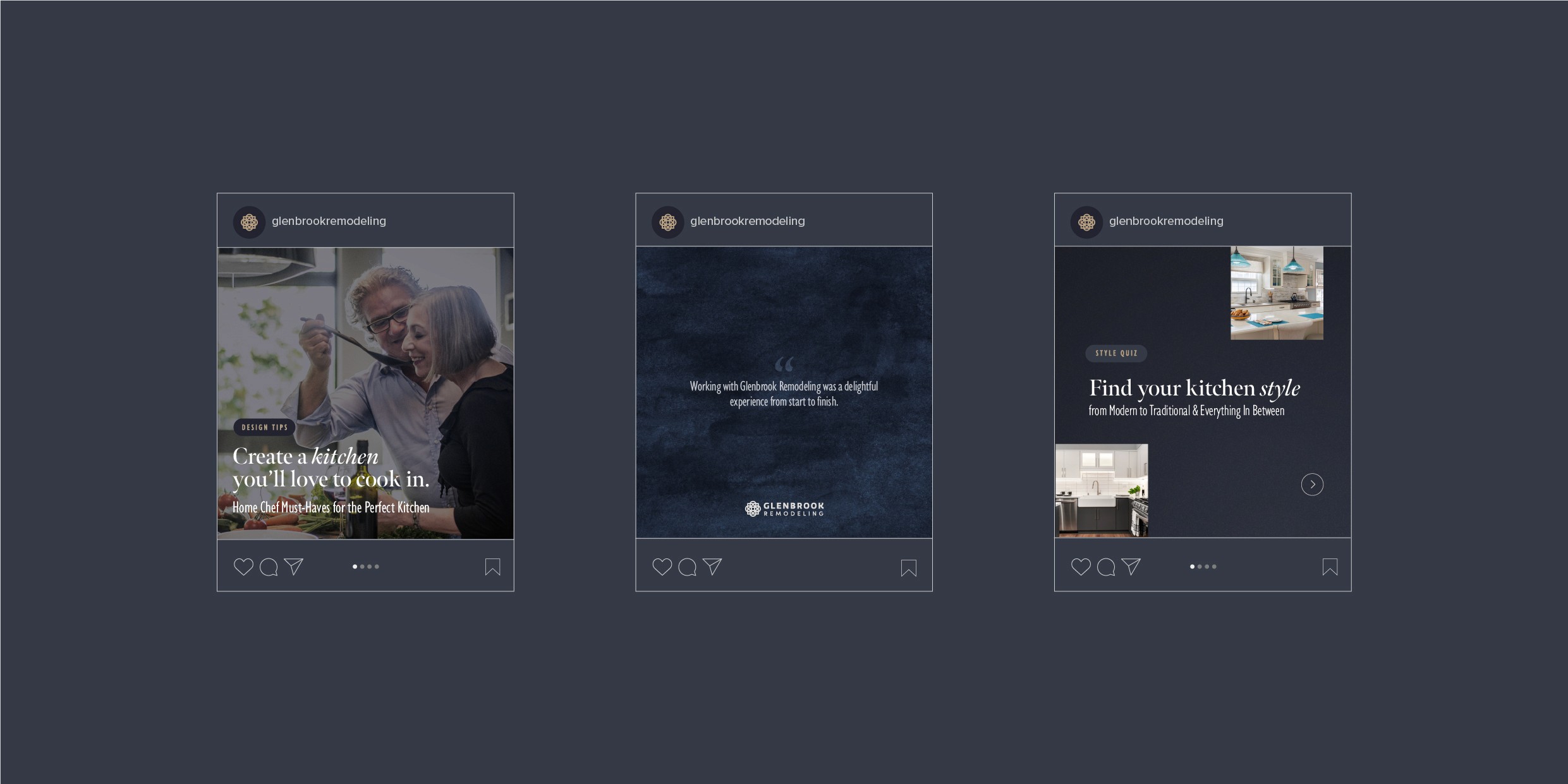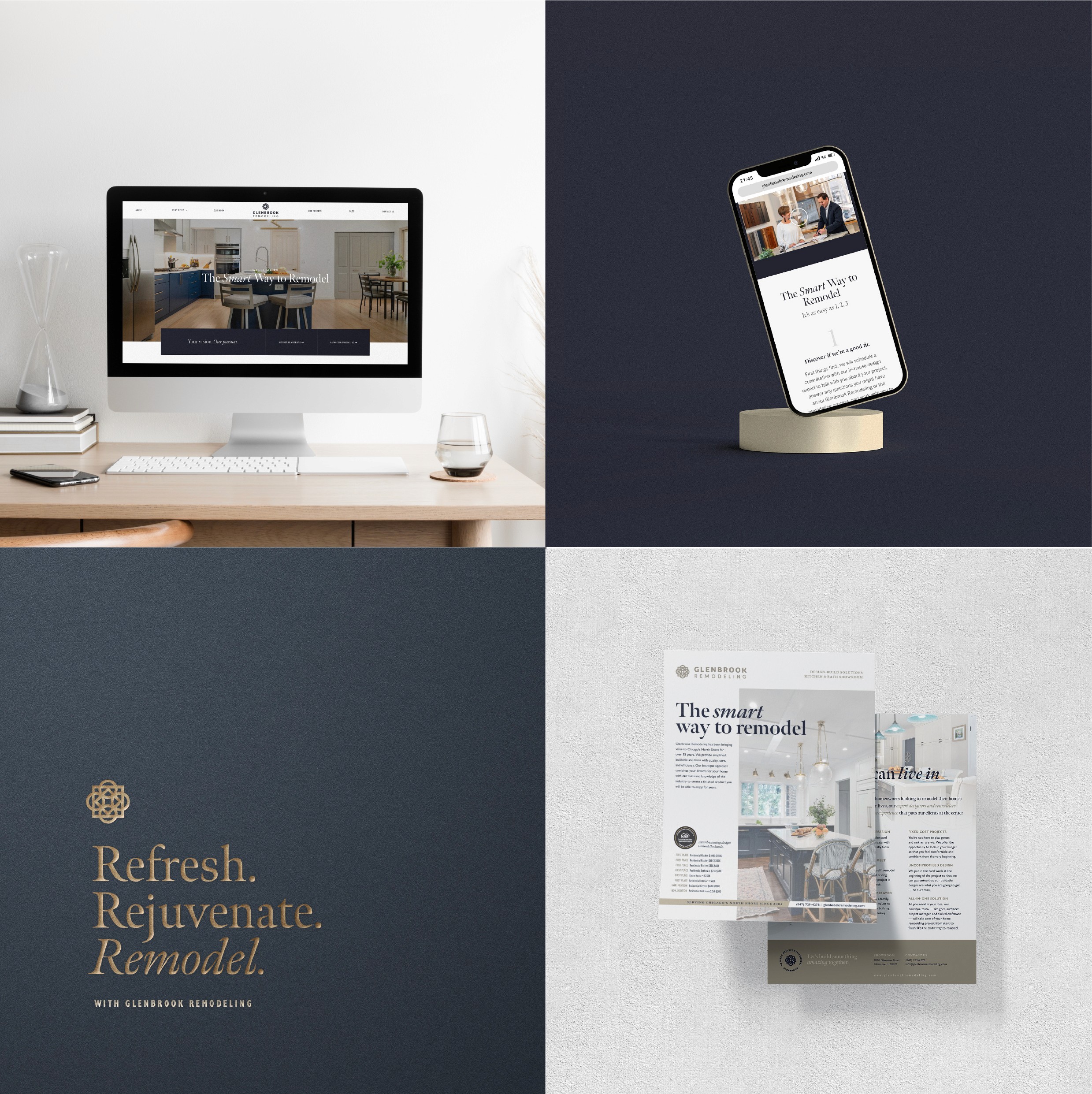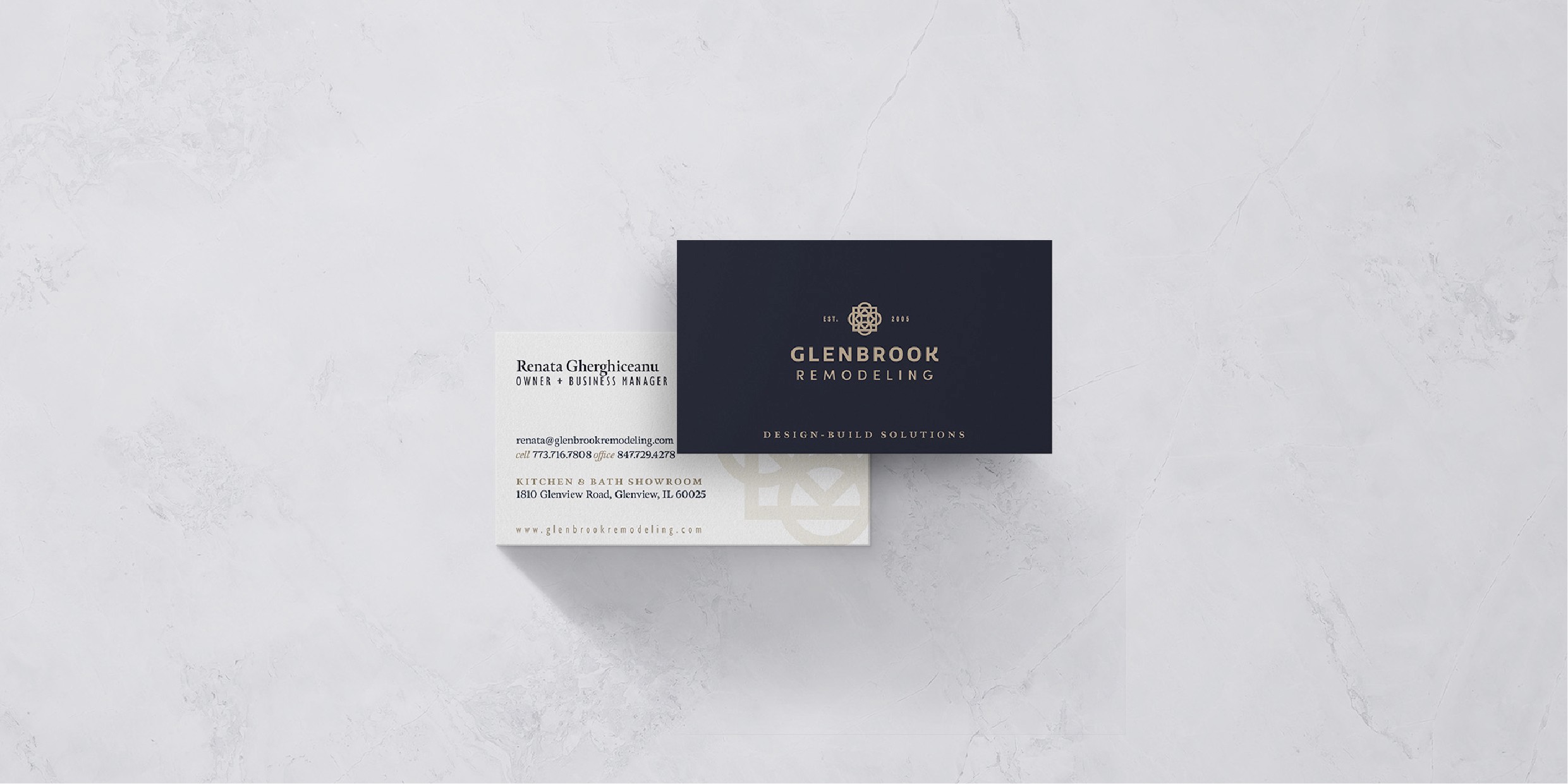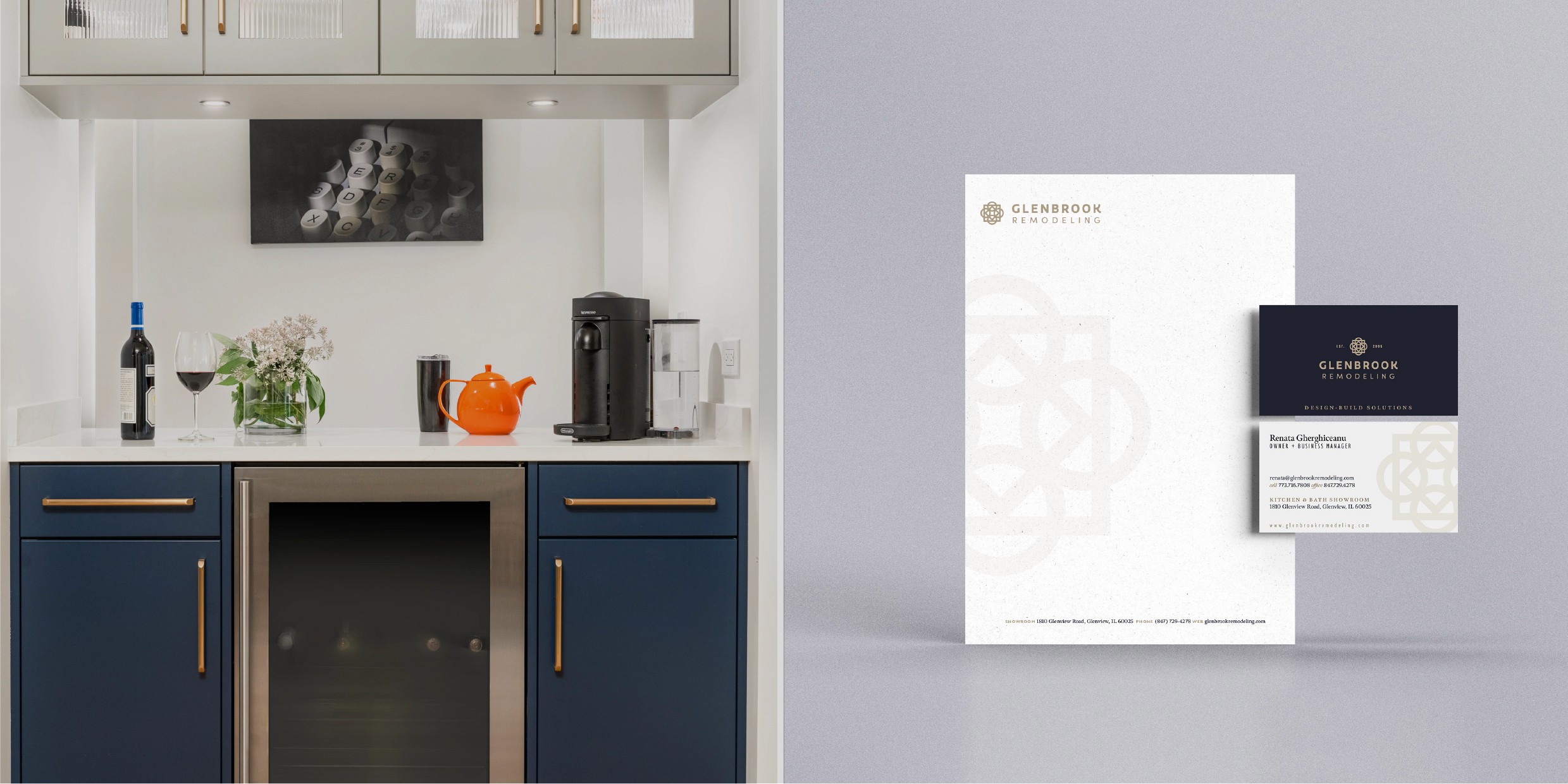 Glenbrook Remodeling was started over 15 years ago as a flooring business by two brothers who loved to work with their hands. That passion and dedication to craftsmanship evolved from those early days installing flooring into a full-service kitchen and bath remodeler, including an in-house design team and retail showroom. The level of service they were providing had outgrown their existing branding, and they recognized that their brand could be better positioned to align with their intended audience. The goal of the rebrand was to create an identity that would project confidence while still being approachable. The brand visual language makes use of repeating patterns and interlocking shapes to represent the client's integrated design-build approach, paired with a sophisticated and minimal color palette.